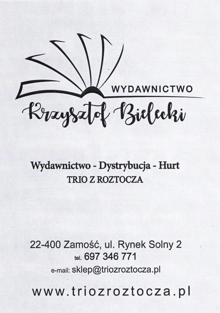 Dlatego, mimo ogromnych problemów w branży księgarskiej, założyłem Wydawnictwo KRZYSZTOF BIELECKI ZAMOŚĆ (TRIO Z ROZTOCZA). Sukcesywnie wydaję książki o tematyce regionalnej, ale nie tylko. Zgłaszają się autorzy, którzy dowiedzieli się o mojej działalności edytorskiej.