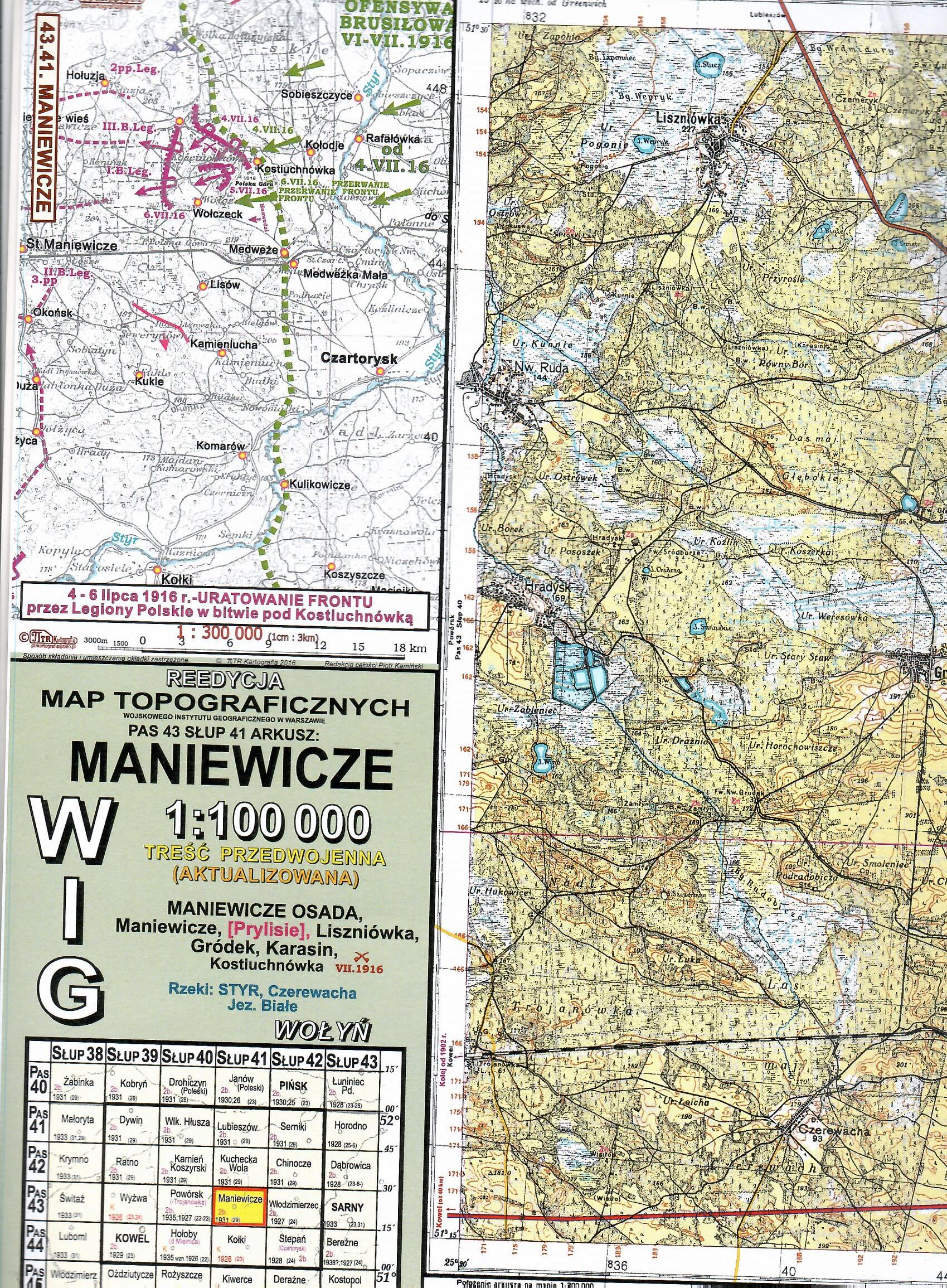 Treść przedwojenna (aktualizowana):  Maniewicze Osada, Maniewicze, (Prilisie), Liszniówka, Gródek, Karasin, Kostiuchnówka – VII 1916                                          Rzeki: Styr, Czerewacha, Jezioro Białe