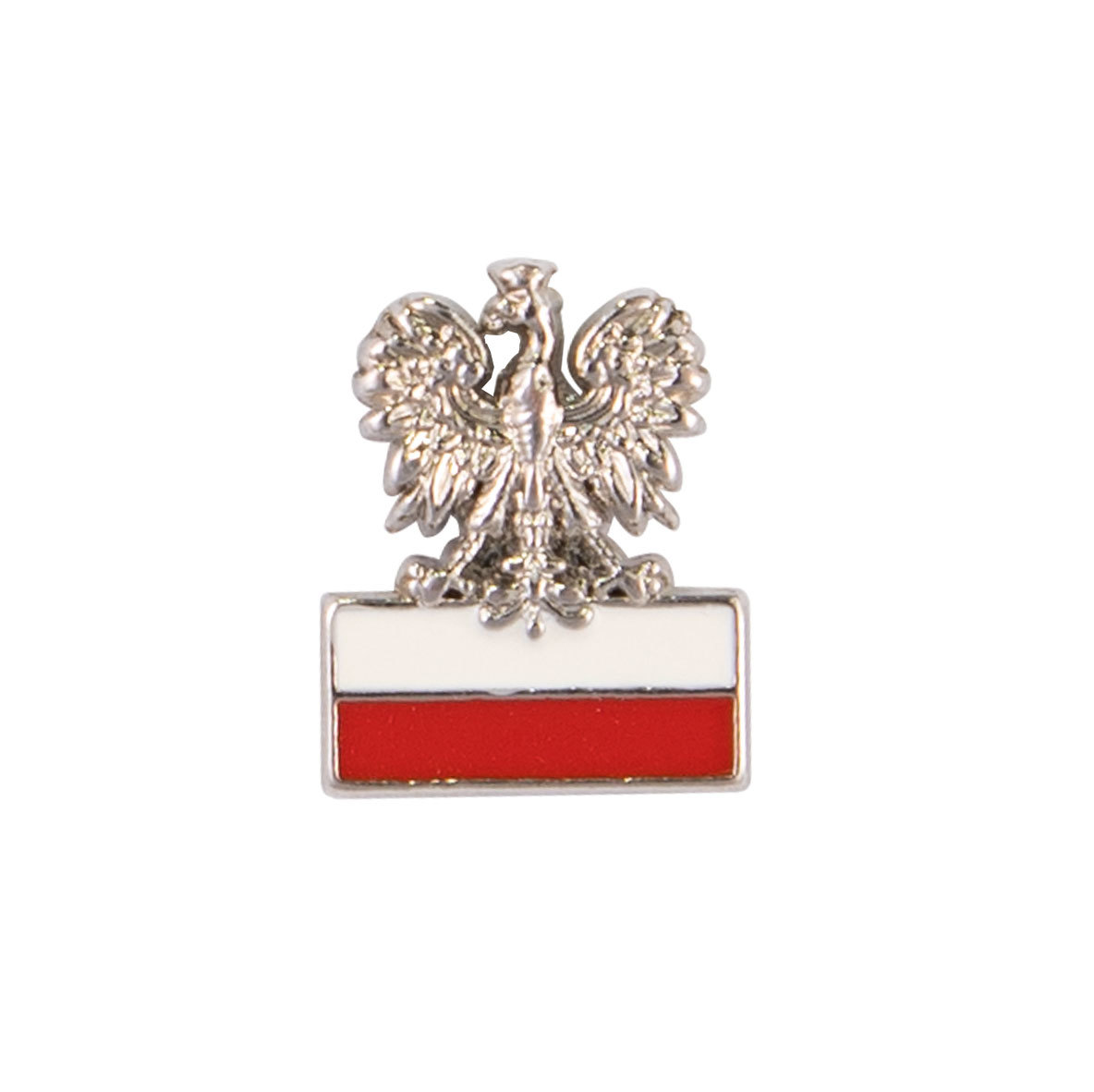Elegancka, metalowa przypinka w kształcie polskiego orła z herbu siedzącego na fladze Polski. Jej zapięcie stanowi nakładka typu butterfly zapewniająca trwałe i bezpieczne przypięcie do garderoby.
